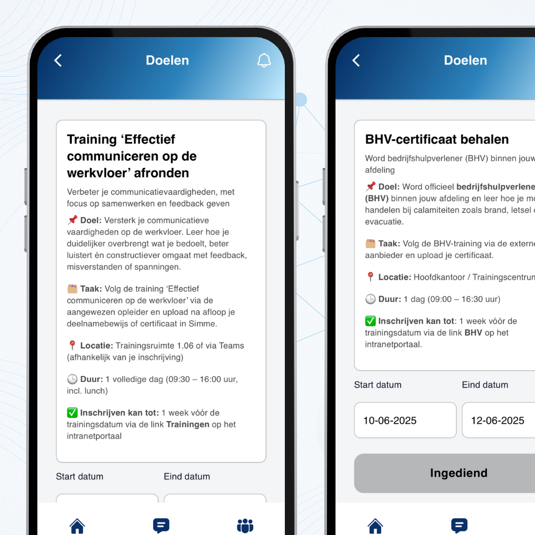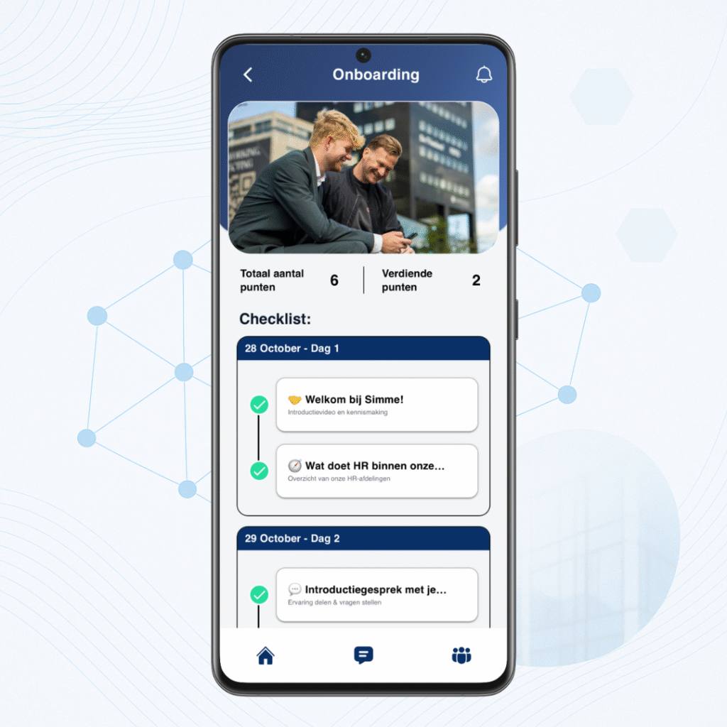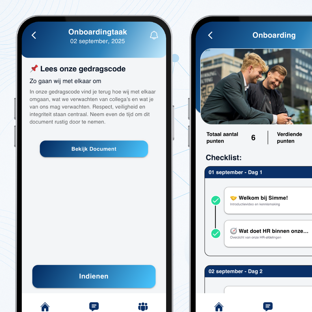 With Simme, you gain full control of the entire employee journey in one go. We quickly set up a custom environment, fully in your branding, so you can get started right away. New hires feel welcome, employees stay engaged and managers maintain clear oversight.